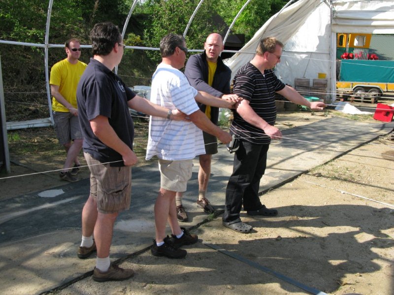 Na enige tijd riep Lex iedereen weer bij elkaar en hij vertelde en liet zien hoe om te gaan als men blind terug moet naar de instap en daarbij kruisende lijnen tegenkomt. Direct daarna werd een team van drie personen aangewezen. Deze personen moesten als team een aangewezen lijn blind terug volgen.